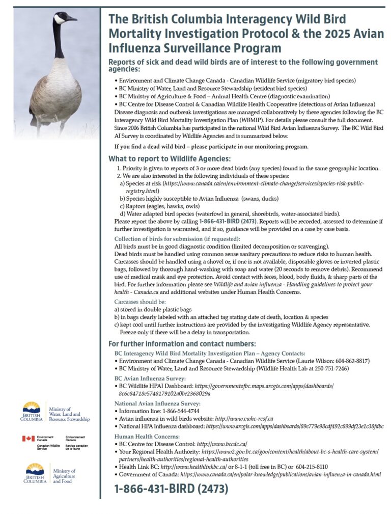 Please see the BC Wild Bird Mortality Investigation Protocol handout for info and whom to contact at the provincial government about dead/dying birds (with bird flu symptoms):